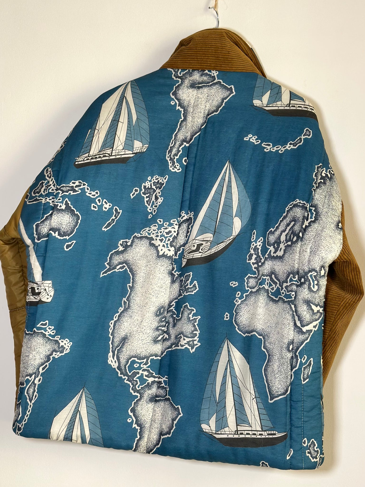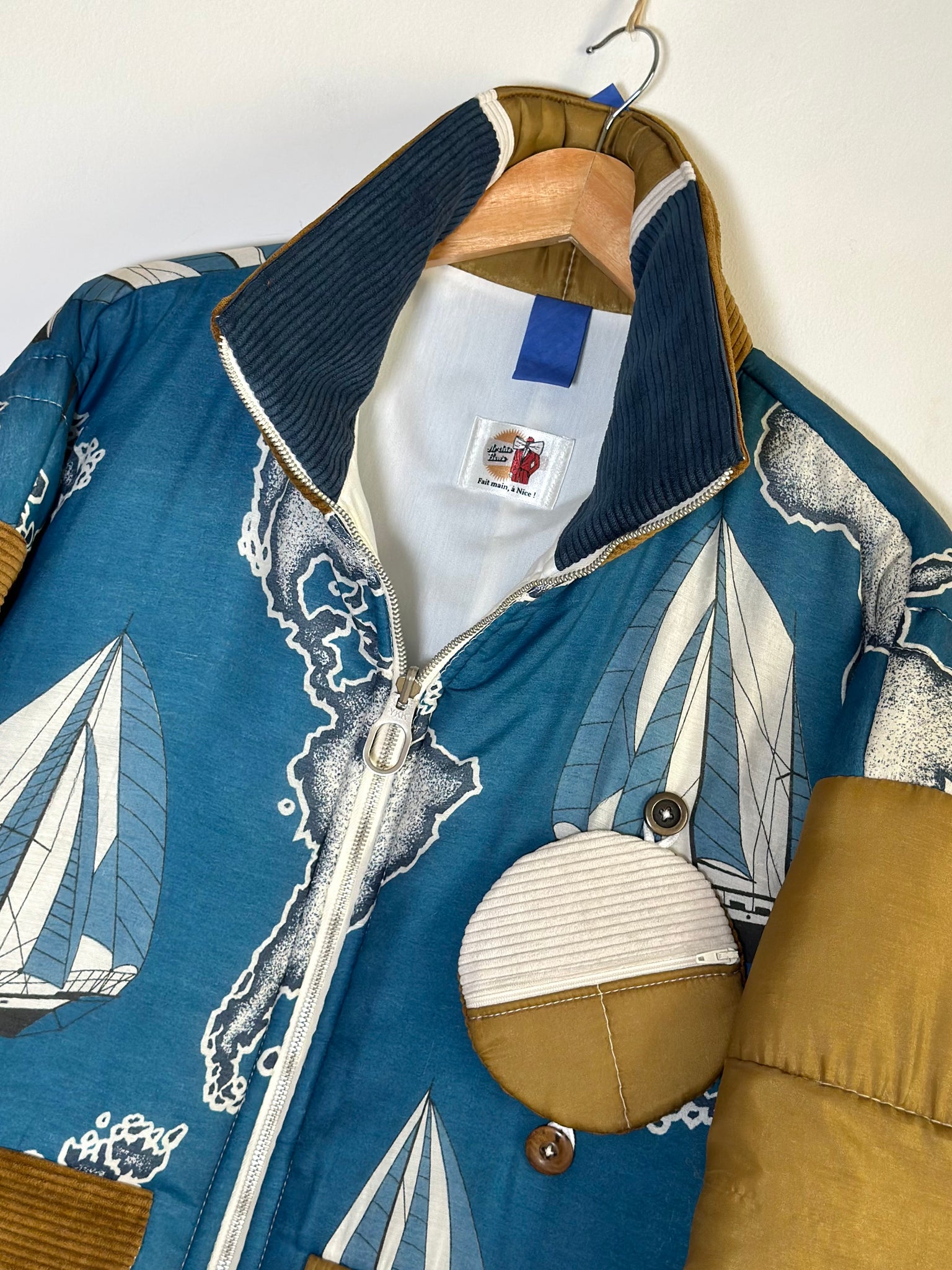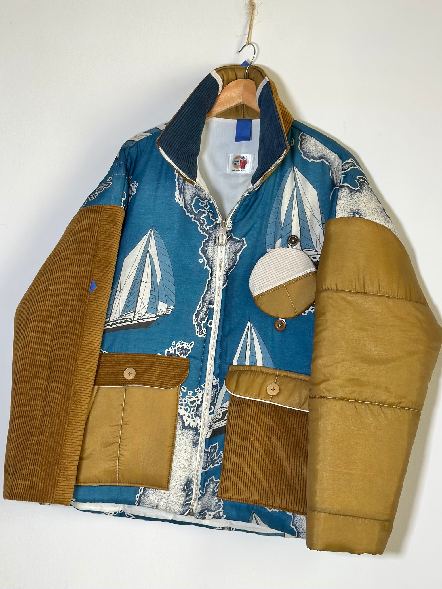Blouson matelassé, coupe oversize, confectionné à partir de 2 sacs de couchage de seconde main.