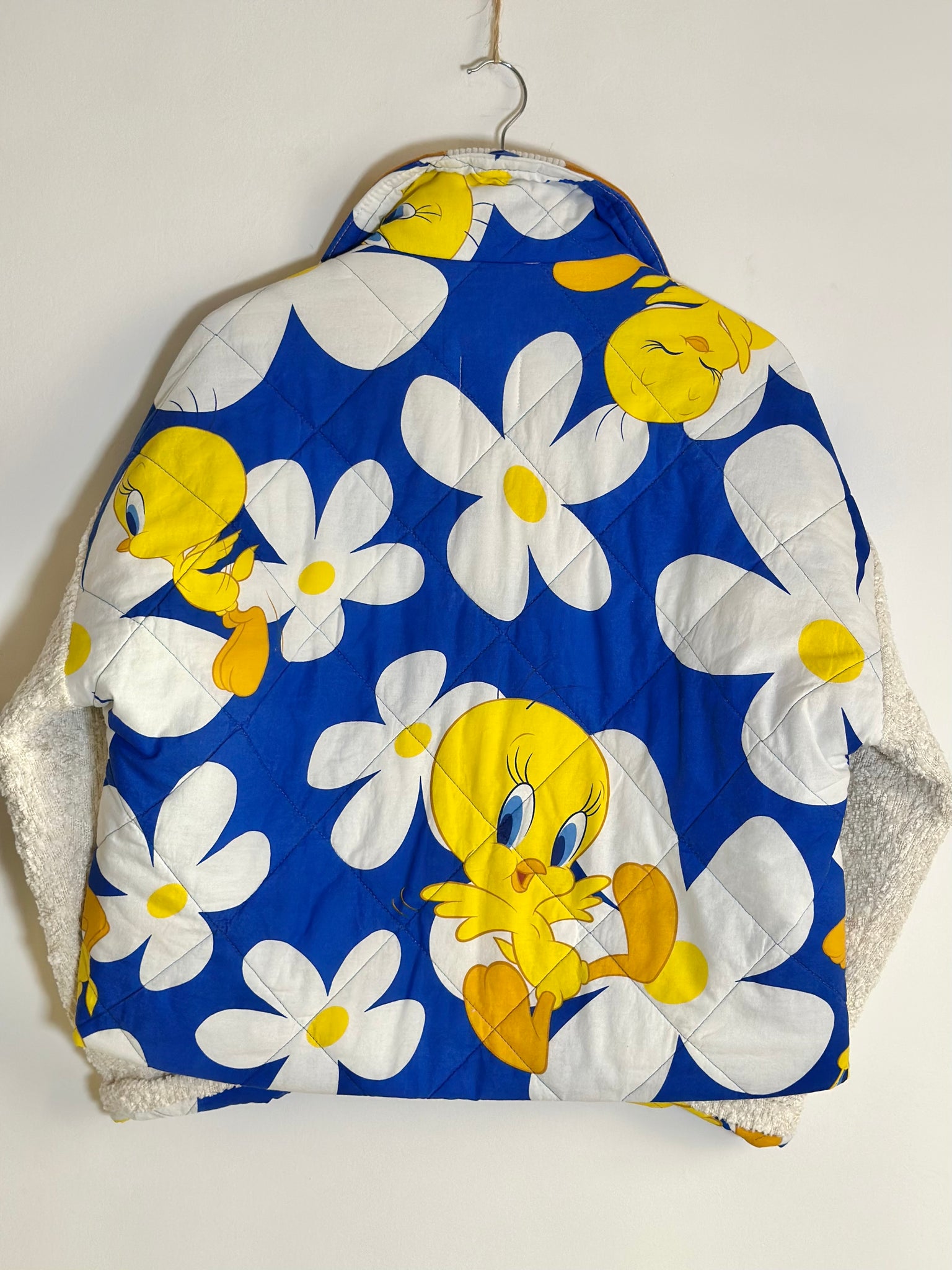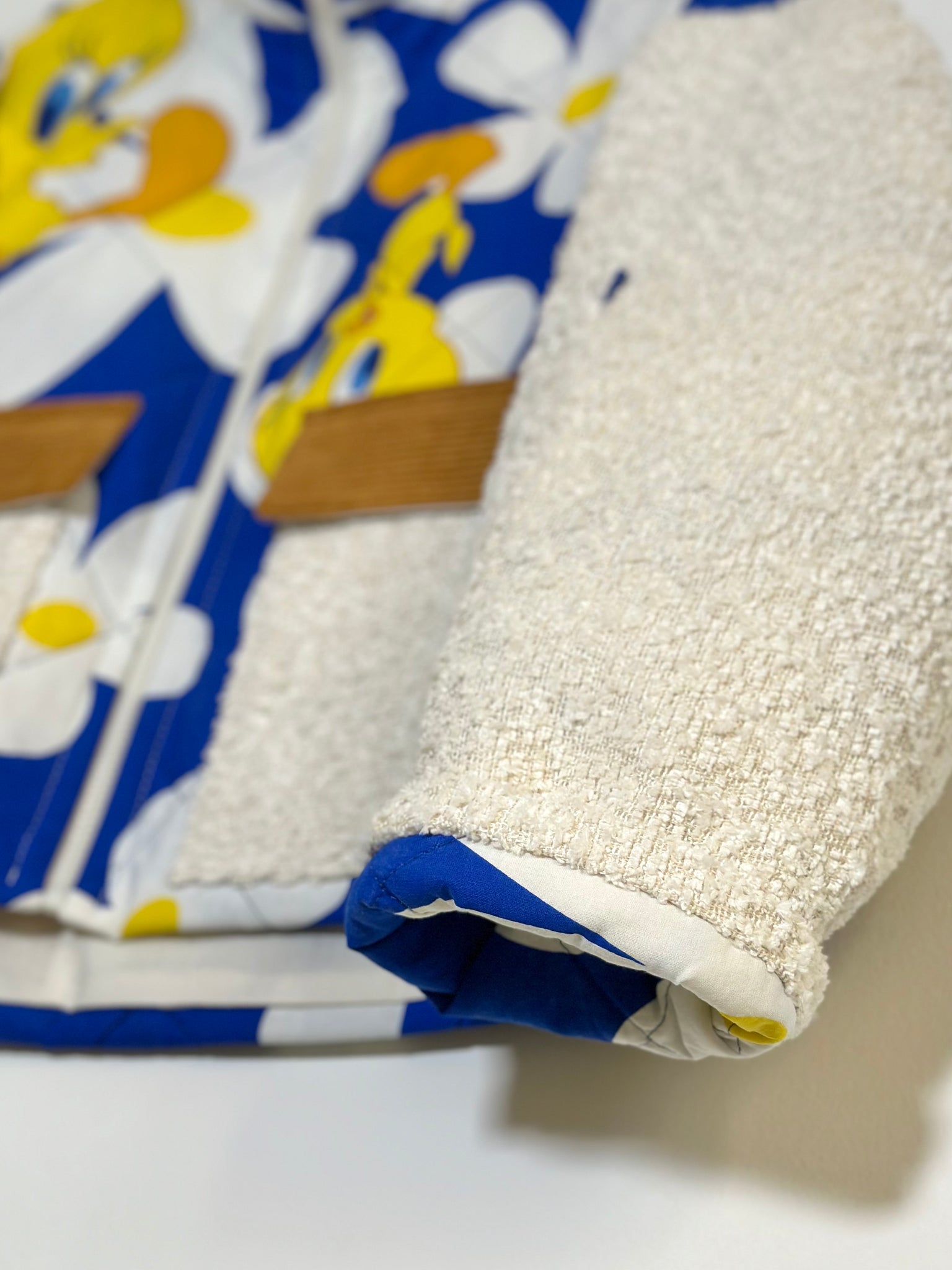 Blouson coupe courte, confectionné à partir d’un couvre-lit de seconde main.