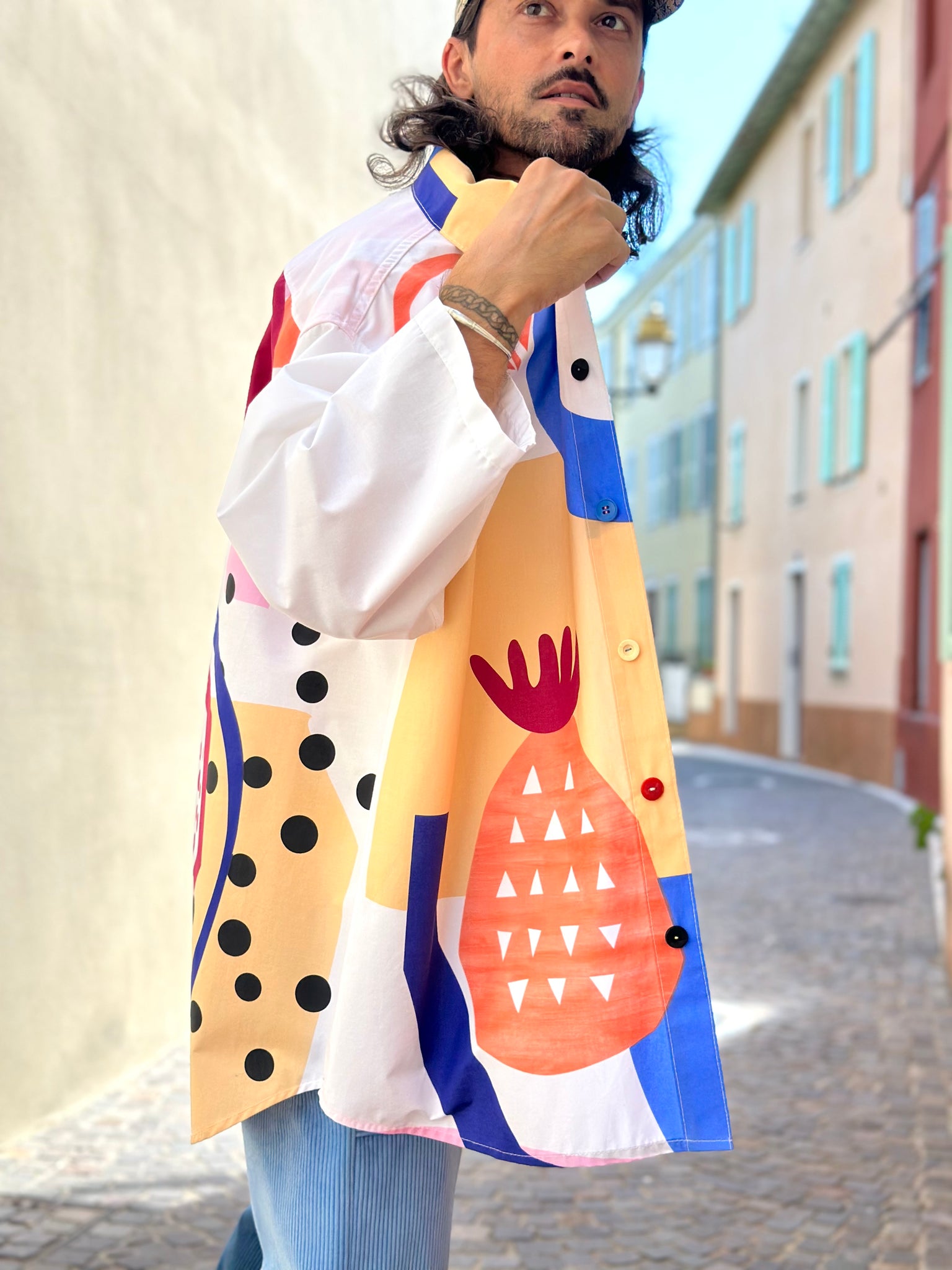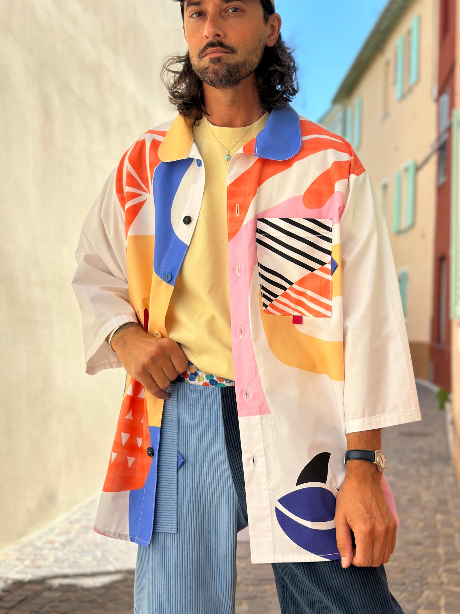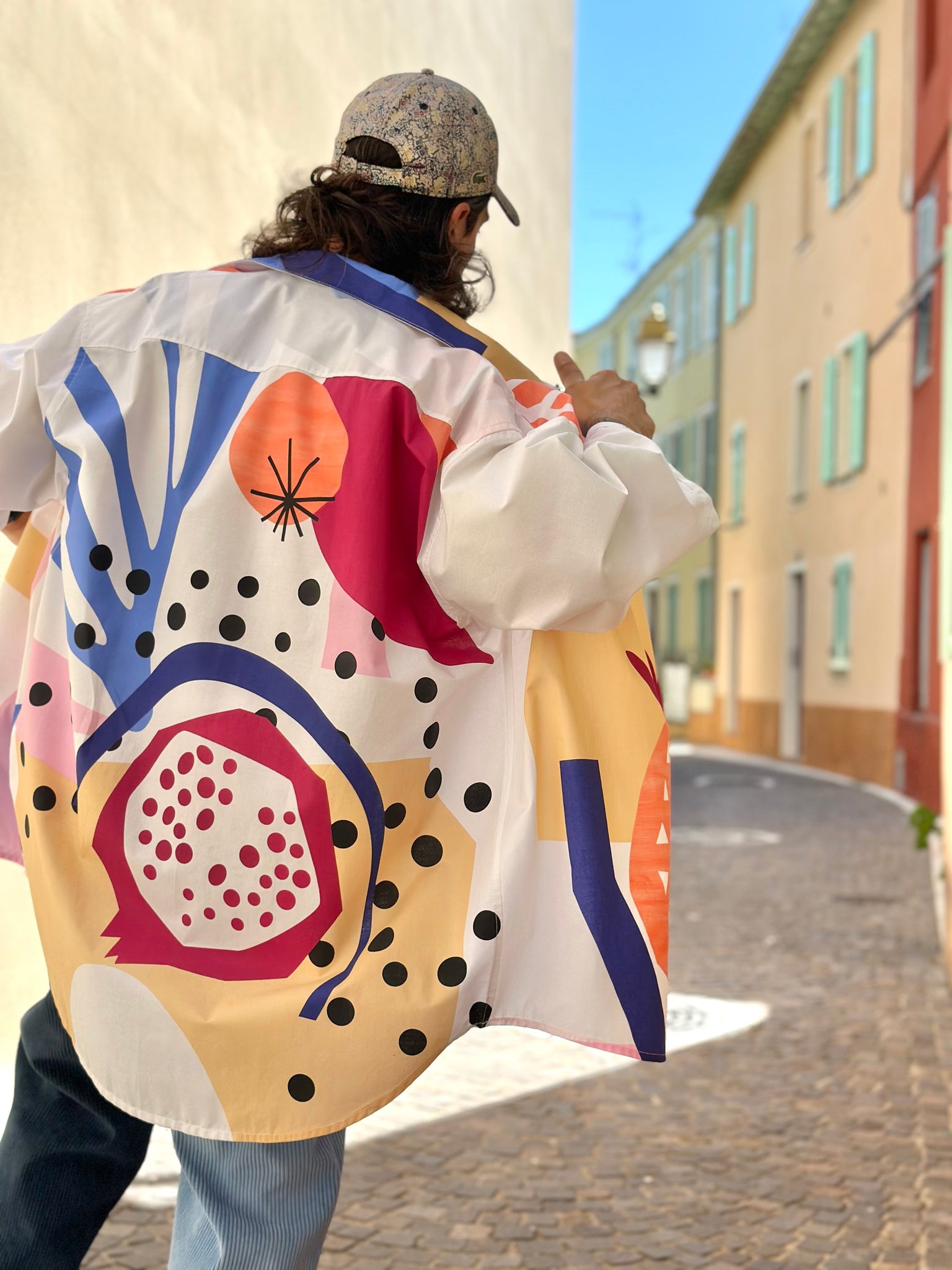 Chemise coupe oversize, confectionnée à partir de 3 draps de seconde main.