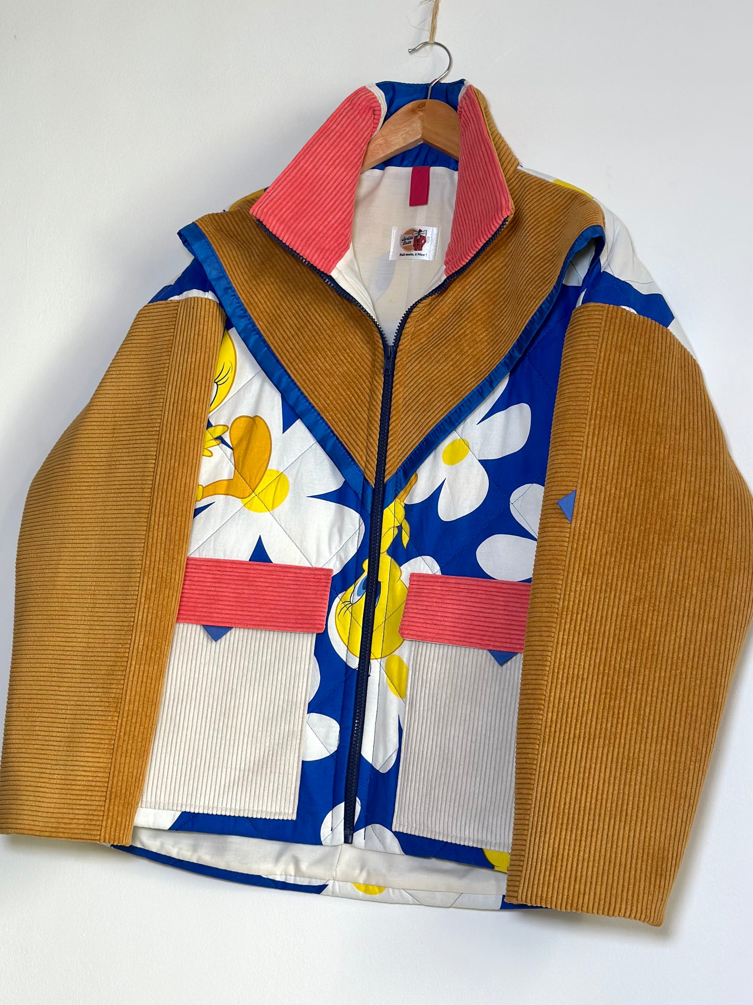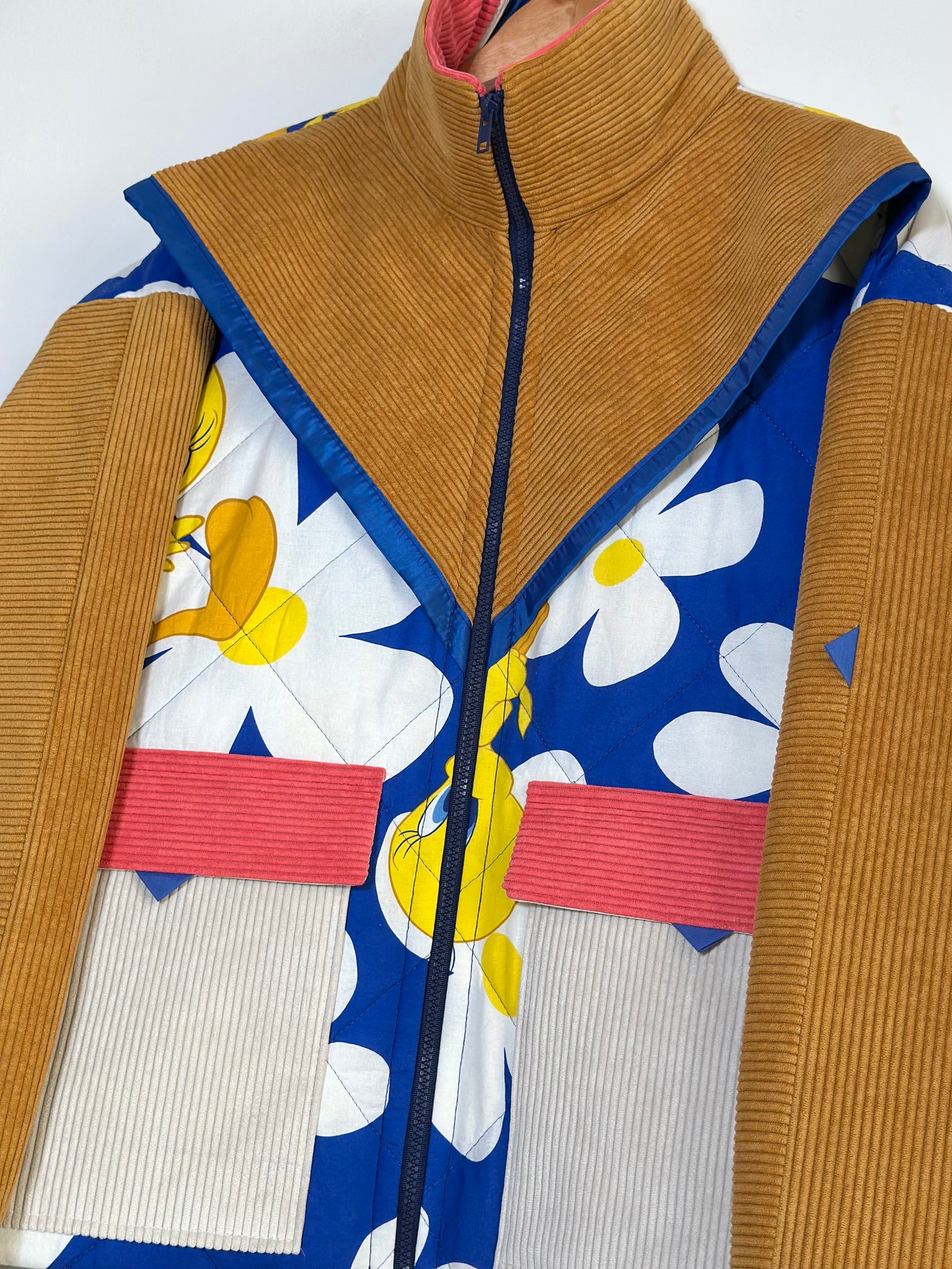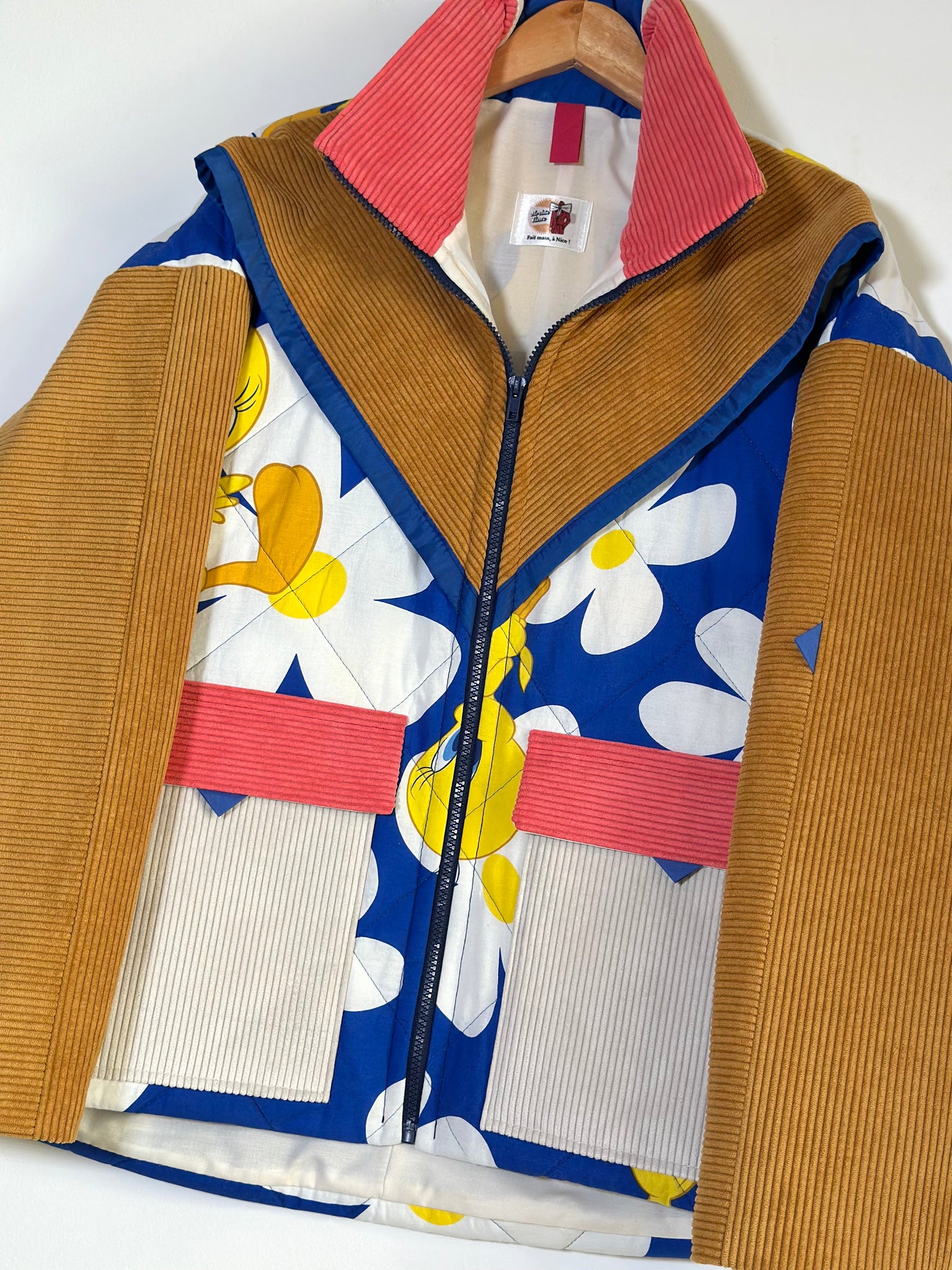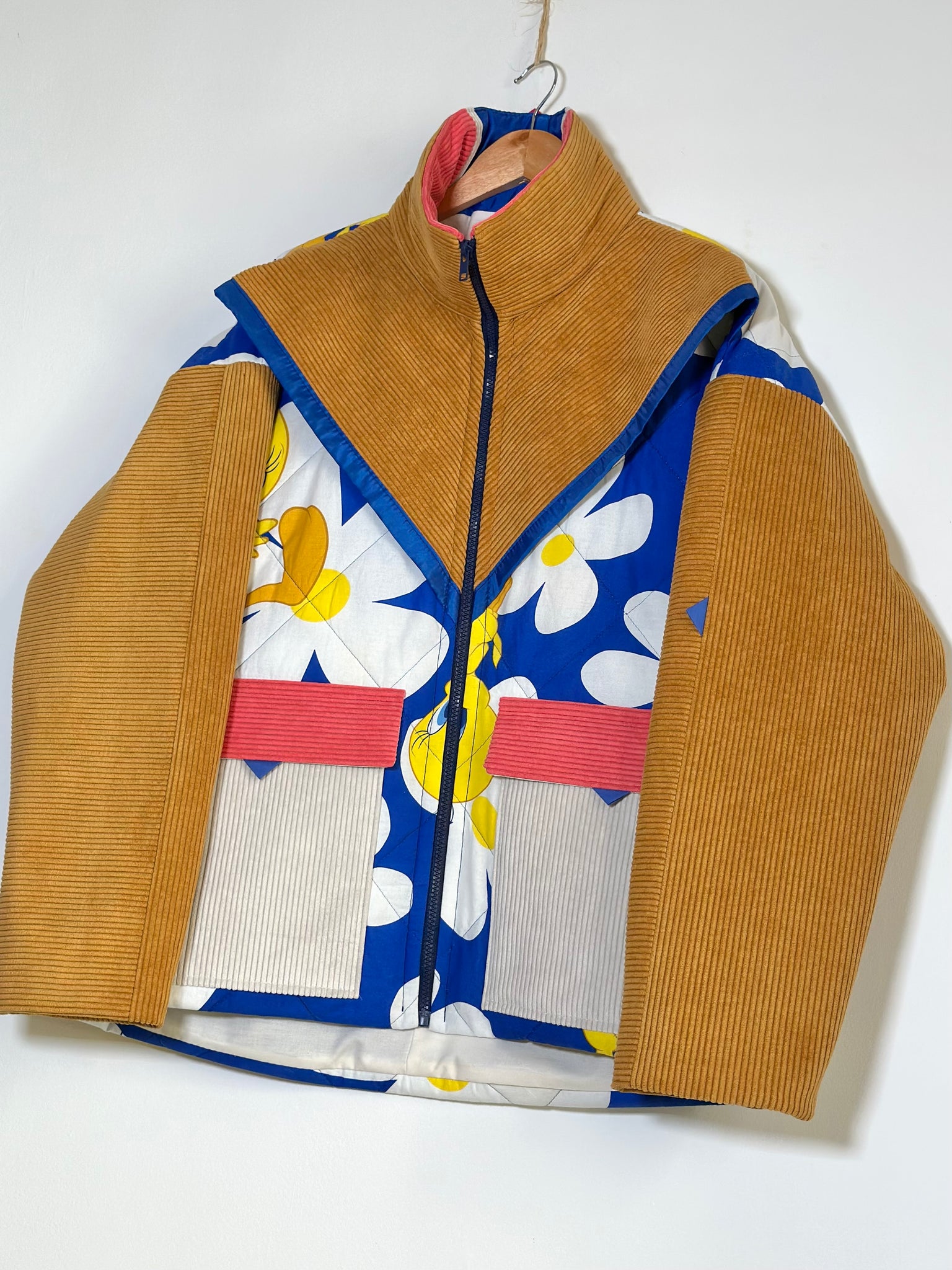 Blouson coupe courte oversize, confectionné à partir d’un couvre-lit de seconde main.
