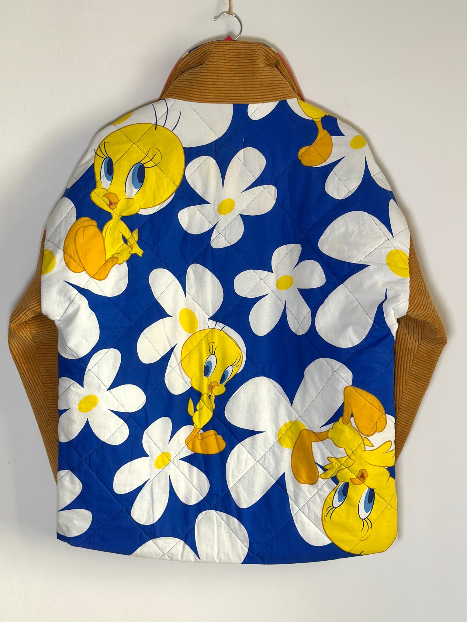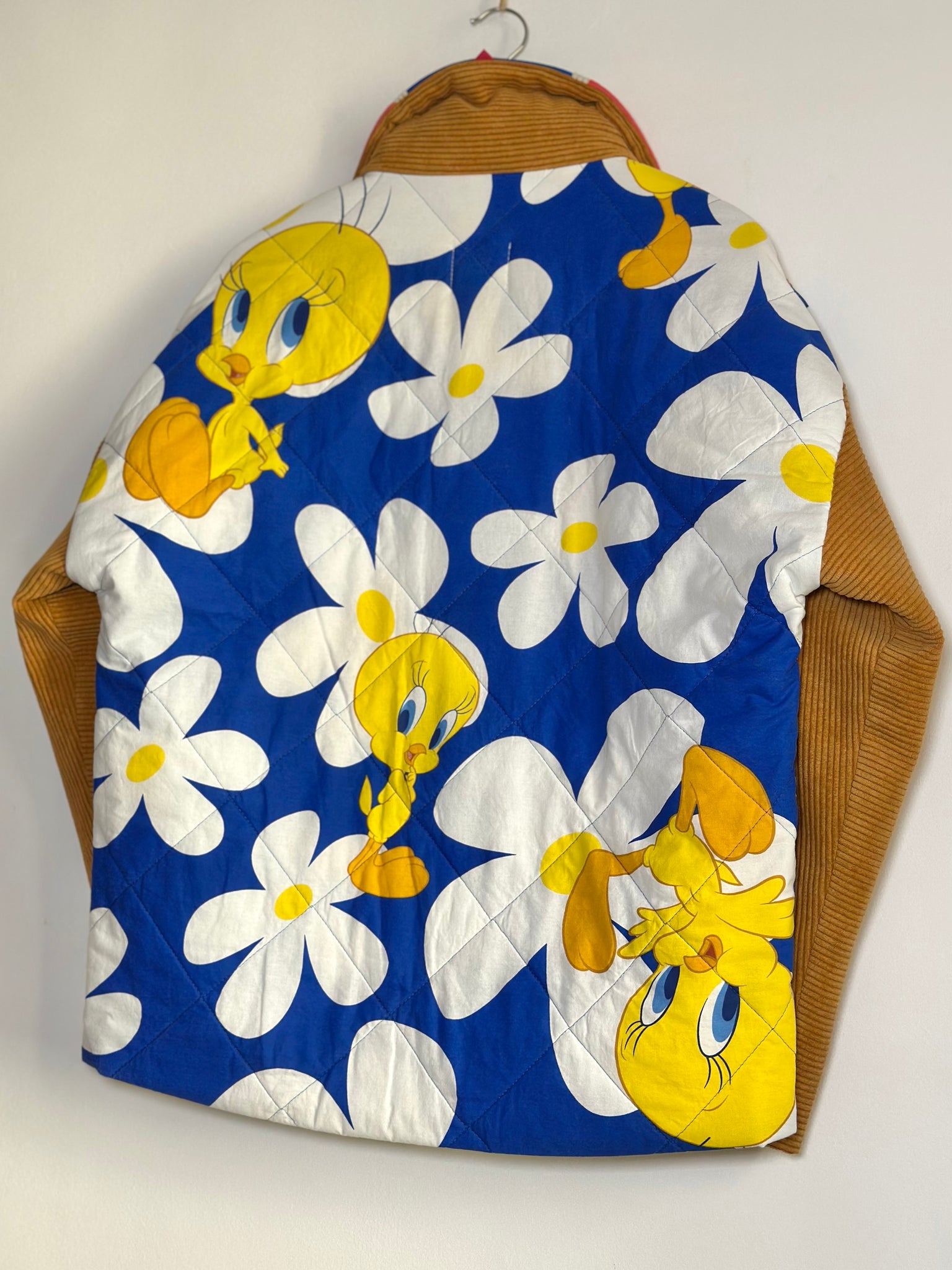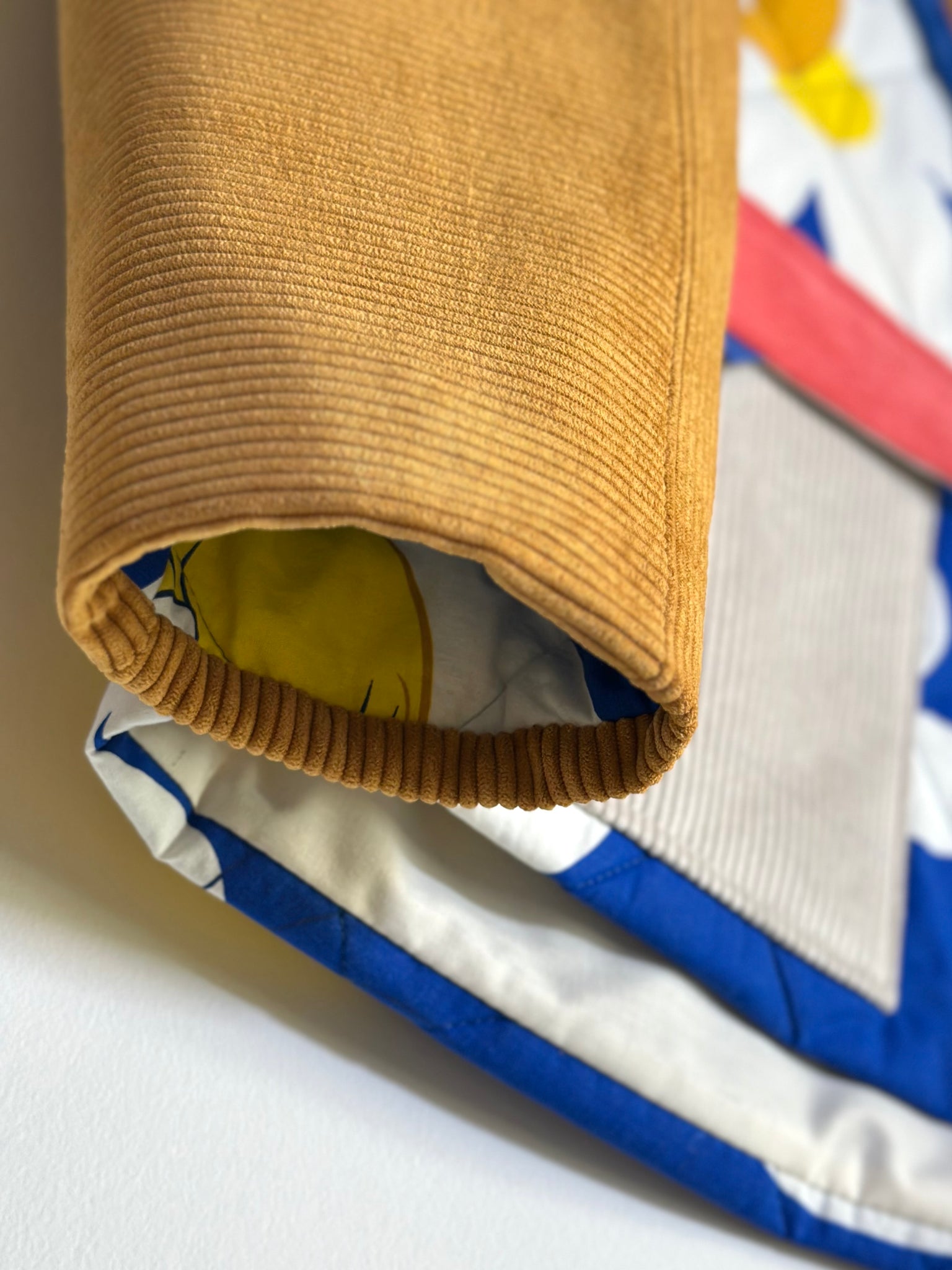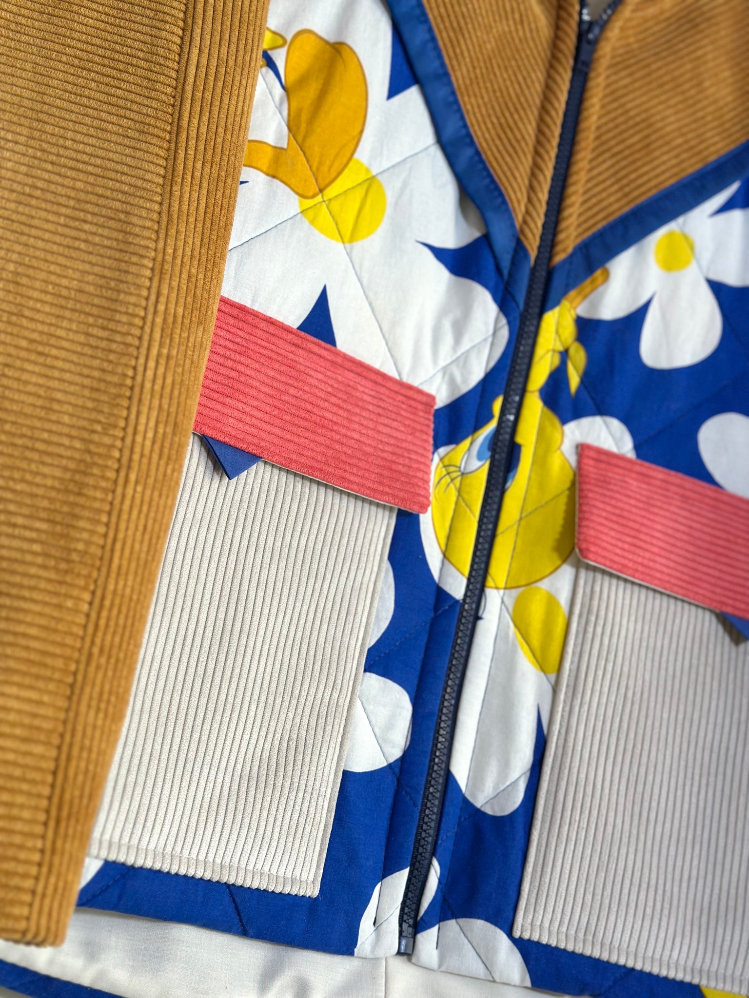 Blouson coupe courte oversize, confectionné à partir d’un couvre-lit de seconde main.
